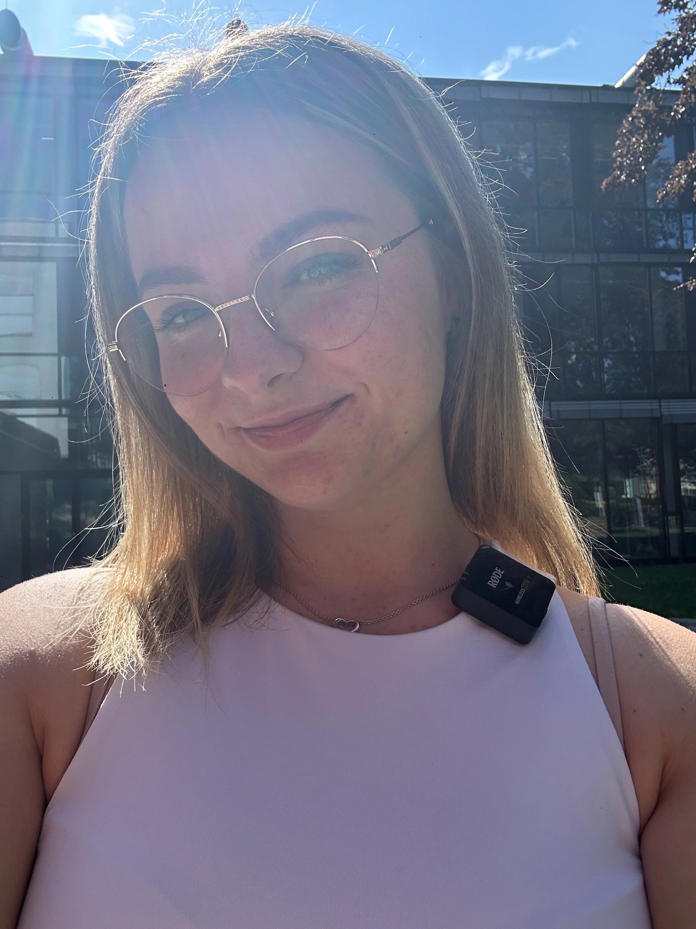 Porträt einer lachenden jungen Frau mit blonden, lockigen Haaren, Brille und Halskette vor einer neutralen Wand.